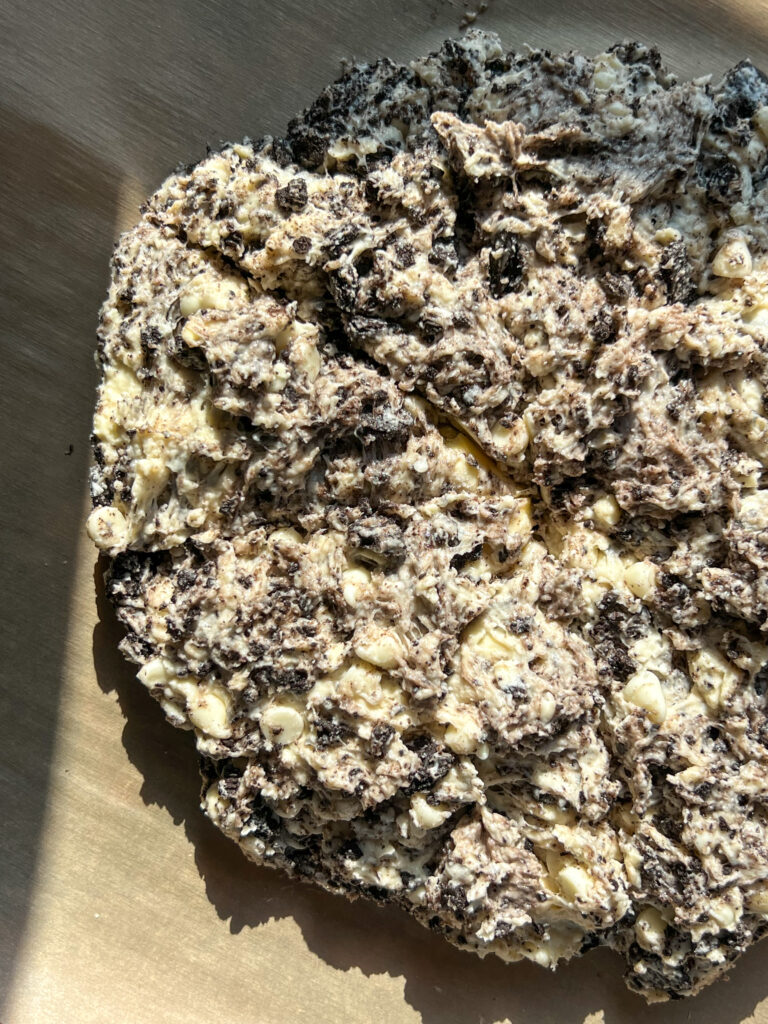 • Fold in 1½ cups white chocolate chips and 1½ cups crushed Oreo cookies; you want the dough to be just sticky enough to stick to your hands. Add more buttermilk 1 tbsp at a time if you feel are too dry. Spread into a circle onto a baking sheet and cut into serving sizes, the same way you would a pizza.