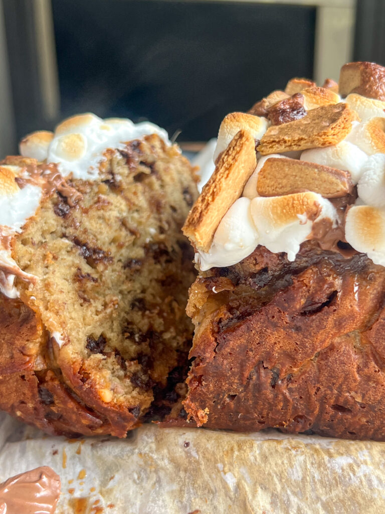 - Top loaf with a handful of marshmallows, chocolate chips and a few pieces of broken graham crackers, until the top is covered. Broil for 1-3 minutes until toasted to liking. Slice and enjoy!